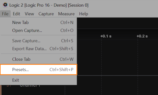 The most recently used capture settings should be automatically loaded in the Logic 2 software upon opening the app. You can also save and load capture settings presets as needed.
