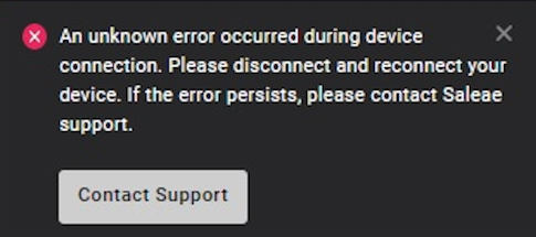This error message may appear during device operation, or upon connecting your Logic device. This error appears when the Logic app detects that a device gets physically disconnected from the PC during initialization. This could be due to a bad USB connection, a faulty USB host controller driver, a fauly Logic pod, or other unkown reasons which might cause the USB connection to time-out during initialization.